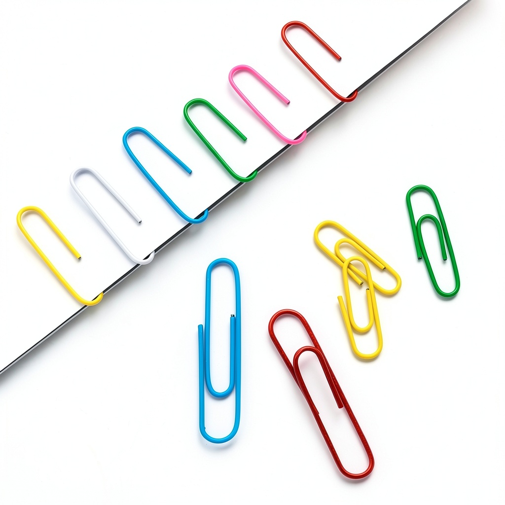 Bflaae paper clips in assorted colors and sizes laid out on a desk