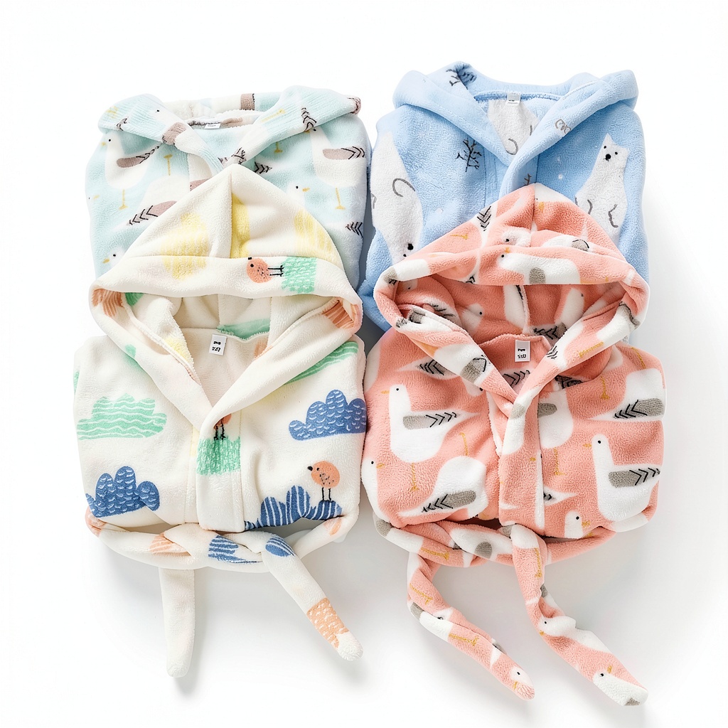 This robe is versatile for multiple environments and occasions, making it a great choice for home lounging, beach walks, birthday parties, or casual outings. It suits toddlers and young children, providing warmth and style in cooler weather. The fixed belt and secure design ensure it stays in place during active play, while the soft fabric makes it comfortable for extended wear.