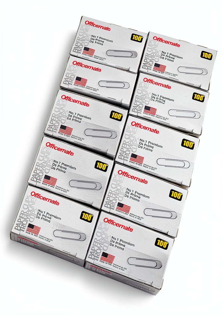 Officemate No. 1 paper clips are essential office supplies designed for efficient document management. Made from high-quality alloy steel, these clips feature a bright, corrosion-resistant silver finish that maintains their appearance over time. Each clip measures to standard No. 1 size, with product dimensions of 8.75 x 2.75 x 1.62 inches for the packaging, and the set includes 10 boxes of 100 clips each, totaling 1,000 clips. The item model number is 99916, and they are manufactured in the USA, ensuring reliable performance and durability for various paper handling tasks.